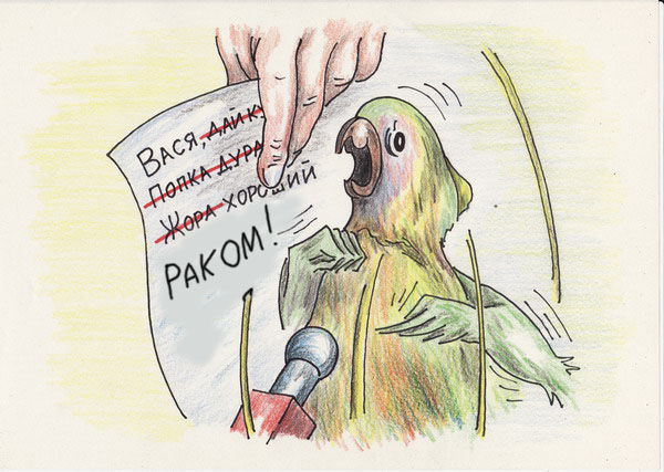 .... Написала, чтобы поправил: попугай у нее не разговаривает!.... Поэтому его крик "Раком, раком!"- это моя чистая выдумка. Теперь клиенты требуют от этой бедной птицы подобных слов ).