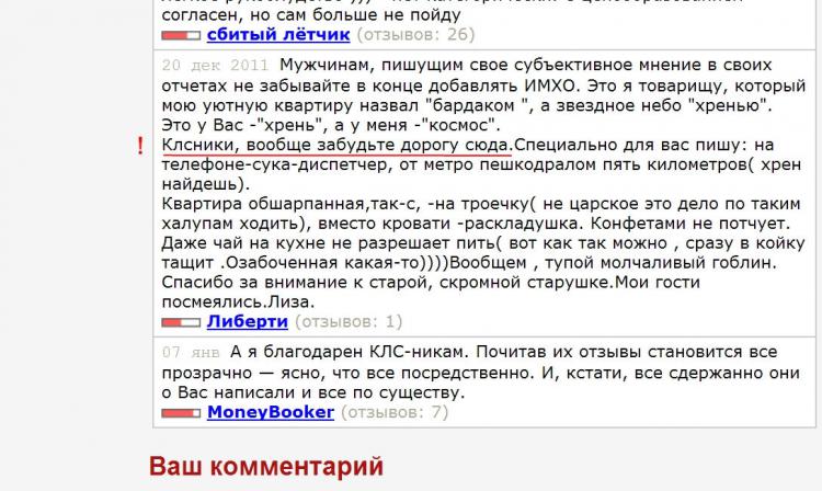 Я уже писала и еще раз повторяюсь : мужчин, страдающих психологическим эксбиционизмом ,меня не беспокоить.Таким мужчинам не стоит ходить ко мне, лучше к наивным, молоденьким девочкам, которые будут хлопать ресницами от вашей невъебенности и слушать ваши "басни Крылова", открыв рот от удивления.У меня только равноценное общение.Я всегда чувствую к себе отношение, уж с моим высшим психологическим образованием видно, кто с каким отношением ко мне приходит,и получает ровно такое же- НЕ БОЛЕЕ!!!!! Всегда очень радуюсь, когда очередная ТП старательно выпячиват высшее психологическое, юридическое, экономическое и прочие образования. Всегда хочется спросить: на каком месте вспухло данное образование? И какого оно вида - просто прыщ или полноценная опухоль? А вам, Мoneybooker , вообще кто-нибудь нравится? Cудя по вашим отзывам о других девушках,вам все не то и все не эдак: то у них" попа мягковата", то "возраст о себе дает знать.".. Кто ищет, тот всегда найдет негатив. Вы пишите по существу , а не то, что где-то прочитали.И очень хорошо, что ВАМ все ясно из прочитанного на секстолке, и Вы ко мне не придете.Я не занимаюсь повышением заниженной самооценки и устранением приобретенных комплексов-мне это не интересно. А как же высшее психологическое? Видимо, тупо лень помогать людям... Ибо я предпочитаю видеть в гостях МУЖЧИН, у которых своя голова на плечах и СВОЕ СОБСТВЕННОЕ МНЕНИЕ, а не баранов ,блеющих вслед за остальными баранами. Данный загиб напомнил о вялотекущих Российских политических коллизиях, многие в интернет-баталиях нынче активно используют слово *Бараны*. Судя по всему, кроме высшего психологического образования имеет место быть активная гражданская позиция и политическая подкованность Мои постоянные гости не выносят на всеобщее обозрение свои интимные похождения с подробностями ,кто куда и кого. Я прямо вижу этих постоянных гостей: Лиза, я пришел! Так: без букета, морда печальная, *входит в контанкт с Высшим психологическим Разумом*. Пошел вон, мне с тобой неинтересно!!! Ваши опусы не тянут на Буковски.Вы тогда уж указывайте размер ваших мужских достоинств для полноты картины, чтобы страждущие после прочтения ваших похождений могли заняться рукоблудием. Какой скрипач-такая и скрипка. Вот с этим кстати я согласен. Но почему об этом рассуждает девушка, дающая в зад за деньги? Жду позитивных мужчин, с уважением относящихся к женщинам.Романтичная Лиза.