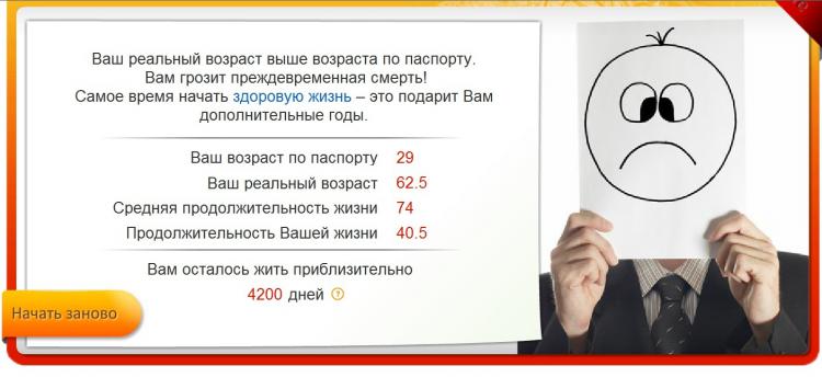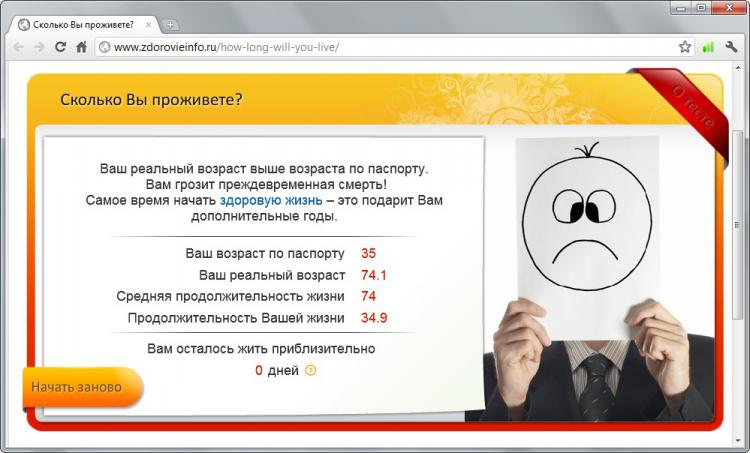 Интересный тест о продолжительности жизни. http://www.zdorovieinfo.ru/how-long-will-you-live/