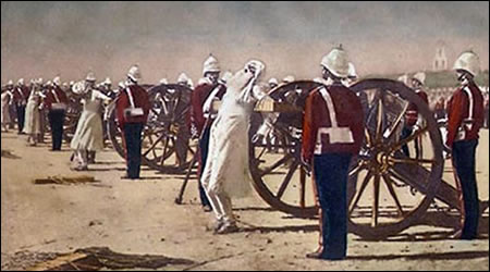 Иное дело у англичан: во-первых, они творили дело правосудия, дело возмездия за попранные права победителей, далеко, в Индии; во-вторых, делали дело грандиозно: сотнями привязывали возмутившихся против их владычества сипаев и не сипаев к жерлам пушек и без снаряда, одним порохом, расстреливали их — это уже большой успех против перерезывания горла или распарывания живота. <…> Повторяю, всё делается методично, по-хорошему: пушки, сколько их случится числом, выстраиваются в ряд, к каждому дулу не торопясь подводят и привязывают за локти по одному более или менее преступному индийскому гражданину, разных возрастов, профессий и каст, и затем по команде все орудия стреляют разом.»