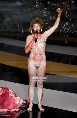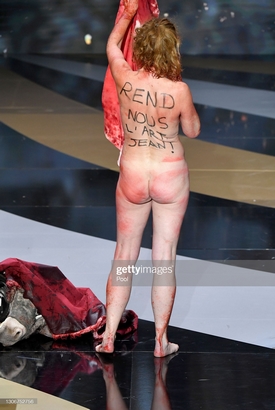 Перформанс был отсылкой к фильму "Ослиная шкура" с Катрин Денев в главной роли и триллеру "Кэрри" по роману Стивена Кинга. Масьеро полностью разоблачилась и продемонстрировала: на груди- "Нет культуры - нет будущего", а на спине - "Верни нам искусство, Жан" (имелся в виду премьер-министр Франции Жан Кастекс).