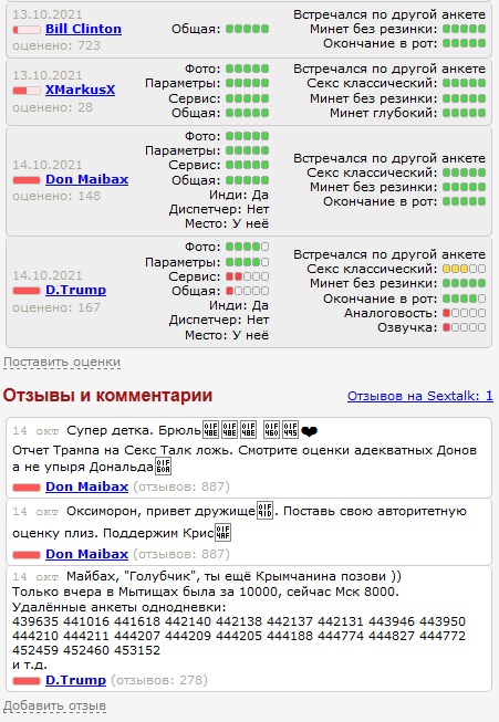 Крым она может даже 100500 лямов поставить это ее право....я просто констатировал факт, что это перебор с учётом различных мнений о ее персоне высказанных как здесь так и на ситях...частая смена анкет тому подтверждение - девы которые долго работают обычно меняют анкеты в случае негатива либо сильно длительного перерыва (у этой мадам такого не было - Макс месяц)..Если она инди чехарда с цениками обычно идёт из-за отсутствия постоянного устойчивого потока средней интенсивности (как правило это постоянники) - это я тебе точно говорю ибо индюх знаю некоторое количество и примерно знаю на какое количество клиентов в день они ориентируются и строят соответственно свой прайс. Из наблюдений на текущий момент - инди, которая имеет определенный круг постоянников обычно ставит 10к (+/- услуги) и включает анкету где-то на 3 дня в неделю (ориентировочно), когда с деньгами напряжёнка - анкета горит 5-6 дней, потом перерыв 3 дня. В среднем принимают не больше 3 клиентов в день....ценик 15к+ ставят те, кто сидит без работы или особо не напрягаются по баблу в данный период времени