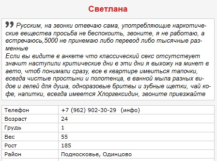 Да, были у неё проблемы, когда работала в Королёве, яичники застудила (болели), трахаться в классике было больно.. И подстава была (по чистому телефону), поэтому с чистыми симками и плохой "пробивкой" даже не пытайтесь...не примет.