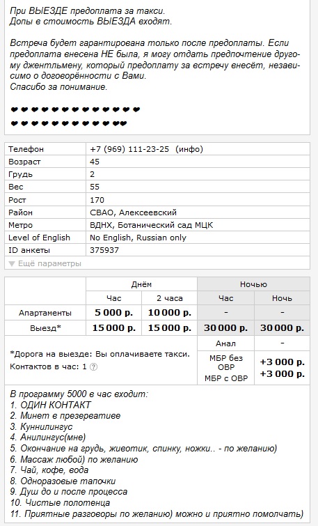 Цена: 5000 руб за 1 час, 10000 руб за 2 часа, 30000 руб за ночь.