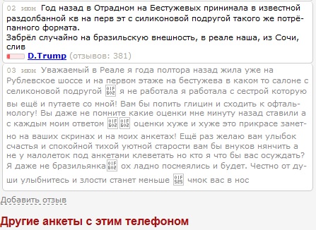 Примечательный пример комментария и оценок пользователя sergious на интимсити под анкетой https://www.intimcity.nl/persons.php?id=436320 Одни пятёрки, особенно за сервис после как гостю в носки надудолили домашние животные И далее по тексту/картинкам (полноценный отчёт бы мог получиться в КЛС)