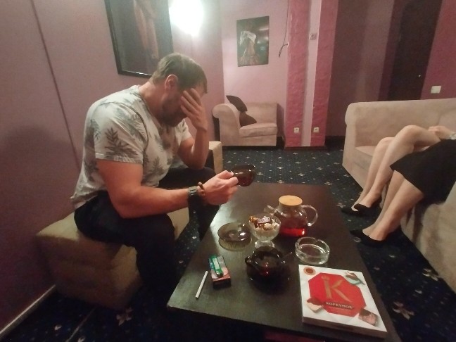 в салоне на ул. Кравченко. Совместный поход клс-ников. Большая гостевая комната. Нам принесли чай с конфетами за счёт заведения. Товарищ А. приехал к Наташе (у которой я был в прошлый раз), её обнажённые ноги видны справа на фото. Я жду красивую милфу Арину.. задерживается, позвонила и сказала, что приедет к 11ч. Забронировал VIP комнату номер 6. Играет приятная музыка, в гостевой работает кондиционер на прохладу. Сервис высший класс!