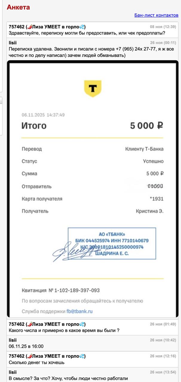 В итоге, настроение испорчено, деньги на ветер. Приезжаю домой, звонок с неизвестного, говорит - ДАЙ ТРУБКУ ЖЕНЕ! Скинул, заблокировал. Приходит сообщение в телегу с тем же самым - заблокировал Потом вацап потом смски. Да-да, сам дурак, что с реального номера звонил, но все же, оценки и отзывы в анкете топовые!