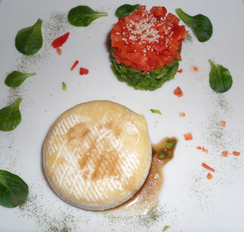 Камабер обжариваем на масле грецкого ореха, сладкий перец мелко режем и укладываем разноцветной стопочкой, тарелочку украшаем листиками салата корн и толченой зеленью сушеной петрушки.