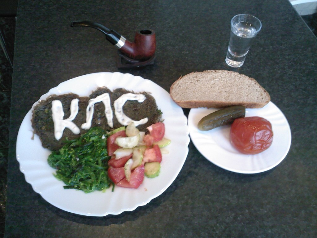 В получившуюся массу из пяти средних картофелин следует добавить одно яйцо (не более) и немного муки, соль и перец. На сковородку оладьи выкладываем любой формы, но высотой не более 9 мм и жарим до золотистой корочки. А такая, поверьте, будет по-любому. Образуем сверху надпись КЛС из сметаны или майонеза (при наличии жены рекомендуется заменить на сердечко и её инициалы) и переходим непосредственно к закуске. Она должна быть приготовлена заранее, ибо сразу присоединяется к еще горячим дерункам. Ну, а почему тут не обойтись без водовки – объяснить не смогу… тут уж каждый для себя решает сам.