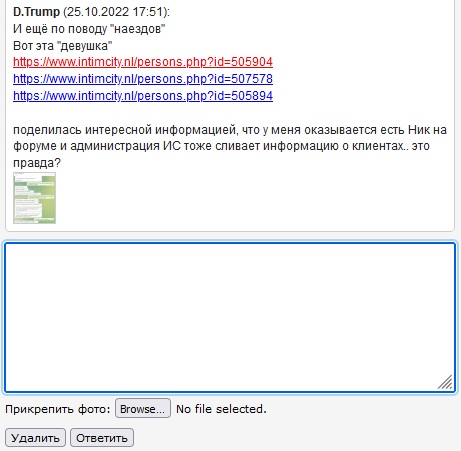 Крым я не знаю что у них там на ИС происходит, но ко мне в личку опять пошли наезды от дев, у которых был ещё в прош году... и эта отписалась (вырезка). Оказывается у меня Ник есть на их форуме и т.д
